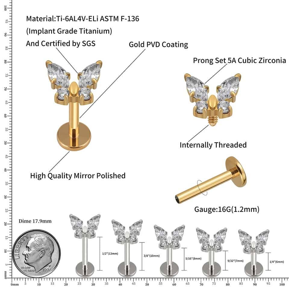 Beautify yourself with this gorgeous, hypoallergenic Titanium Butterfly Gem Threaded Labret! Its stylish butterfly gem design and lightweight construction will make a stunning statement without weighing you down. A perfect choice for those seeking a new piercing!