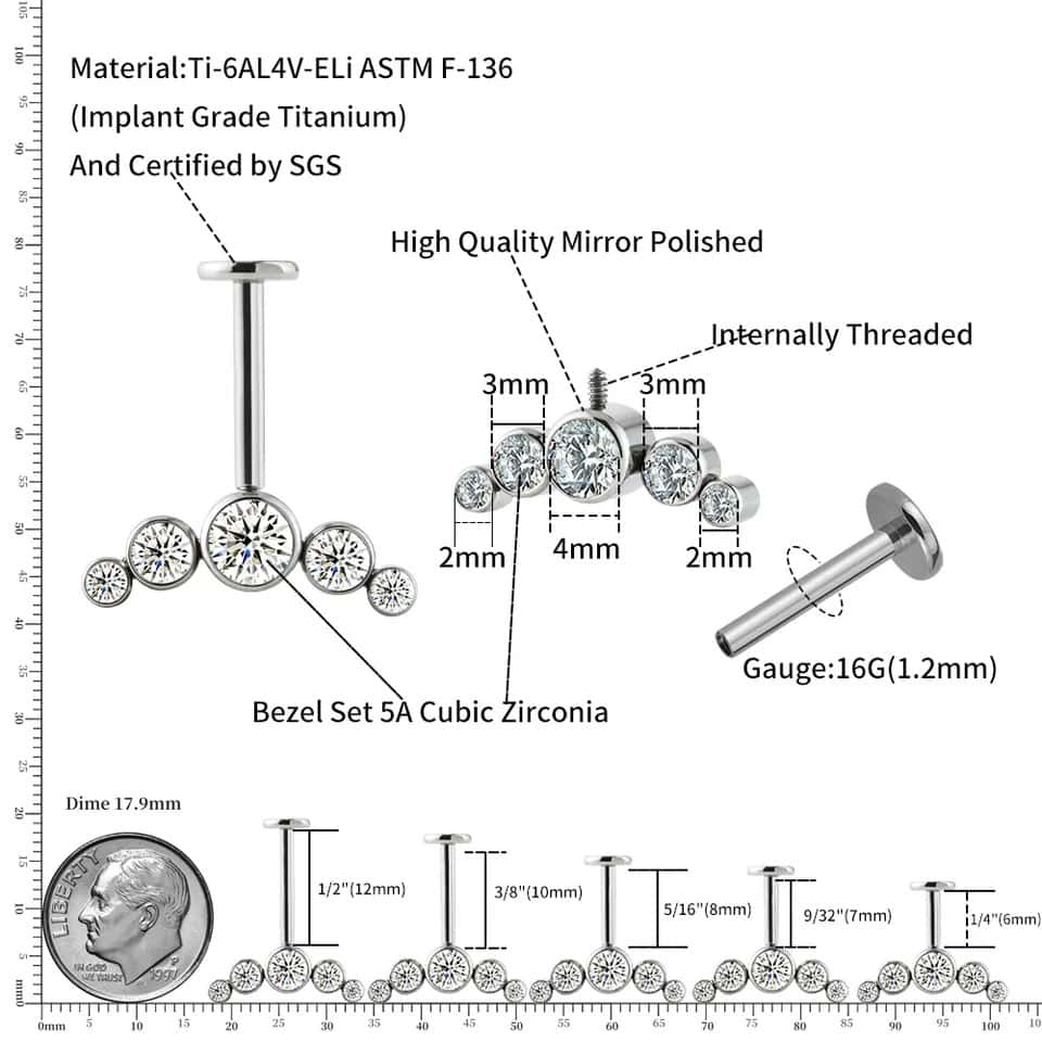 Experience the luxury of implant grade titanium combined with the glittering brilliance of Bezel set 5A cubic zirconia with our Titanium Floating Cluster Bezeled Gem Labret. High-quality mirror-polished to perfection and hypoallergenic, this gorgeous accessory will transform your look. Get ready to sparkle!