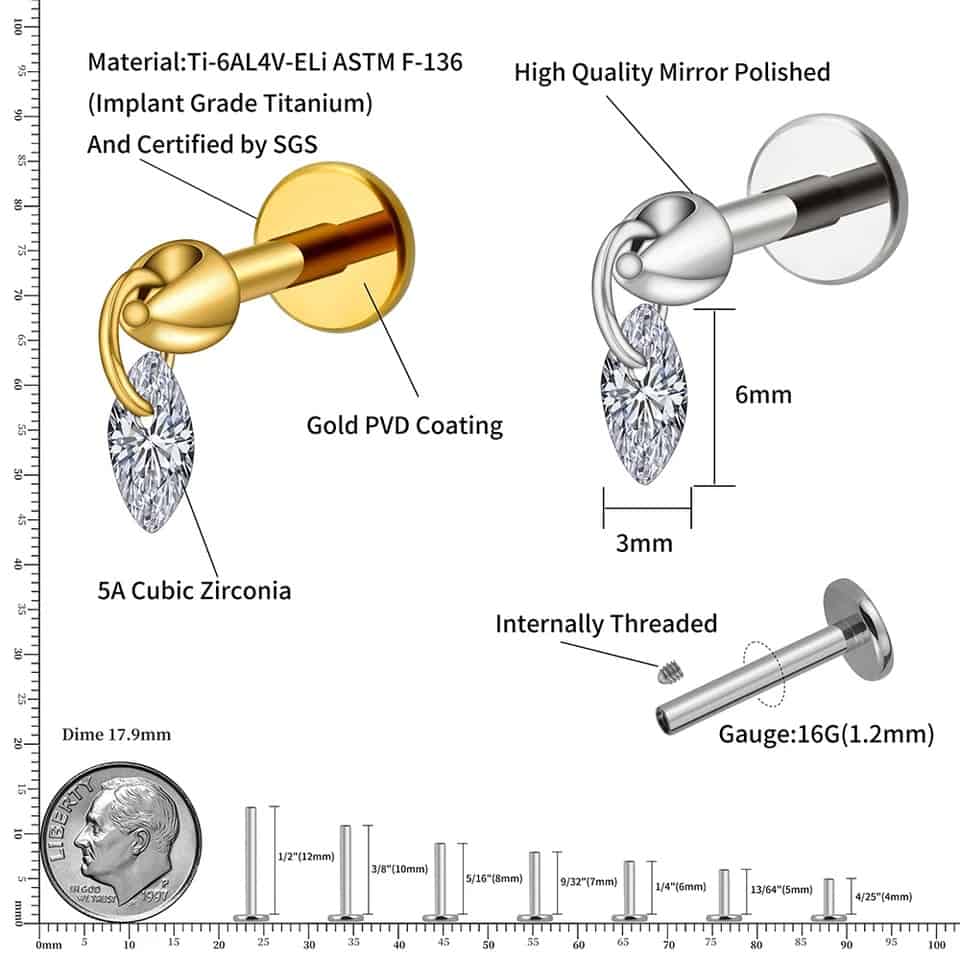 Look glamorous in our Titanium Floating Marquis Gem Labret. Crafted from implant grade titanium certified by SGS, it features a high quality mirror polished finish with gold PVD coating for extra shine. Internally threaded and hypoallergenic, each piece is set with a stunning 5A cubic zirconia for an eye-catching sparkle. Dare to shine!