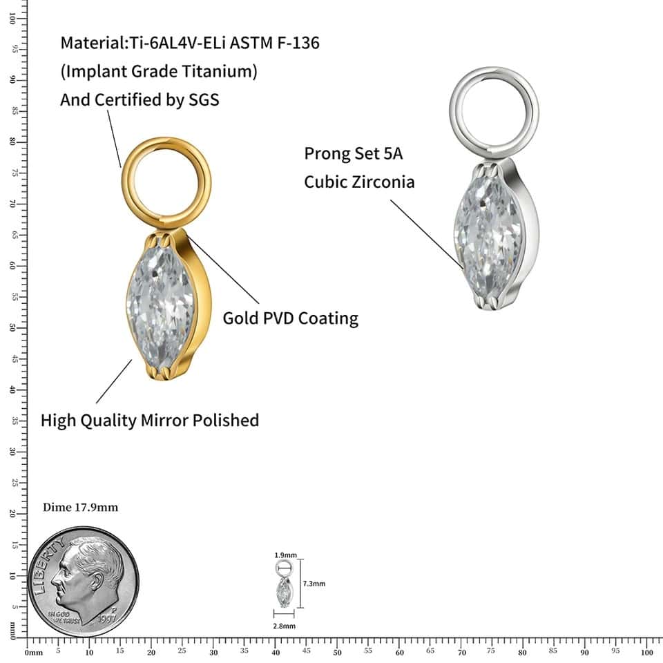 Our Titanium Marquise Gem Charm is crafted from the highest grade implant titanium with a stylish marquise-shaped gem for an eye-catching aesthetic. Enjoy this charm for any hoops labret and barbell earrings, and transform your look! Wear it with pride and show off your unique style!